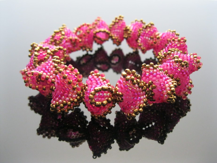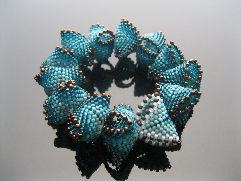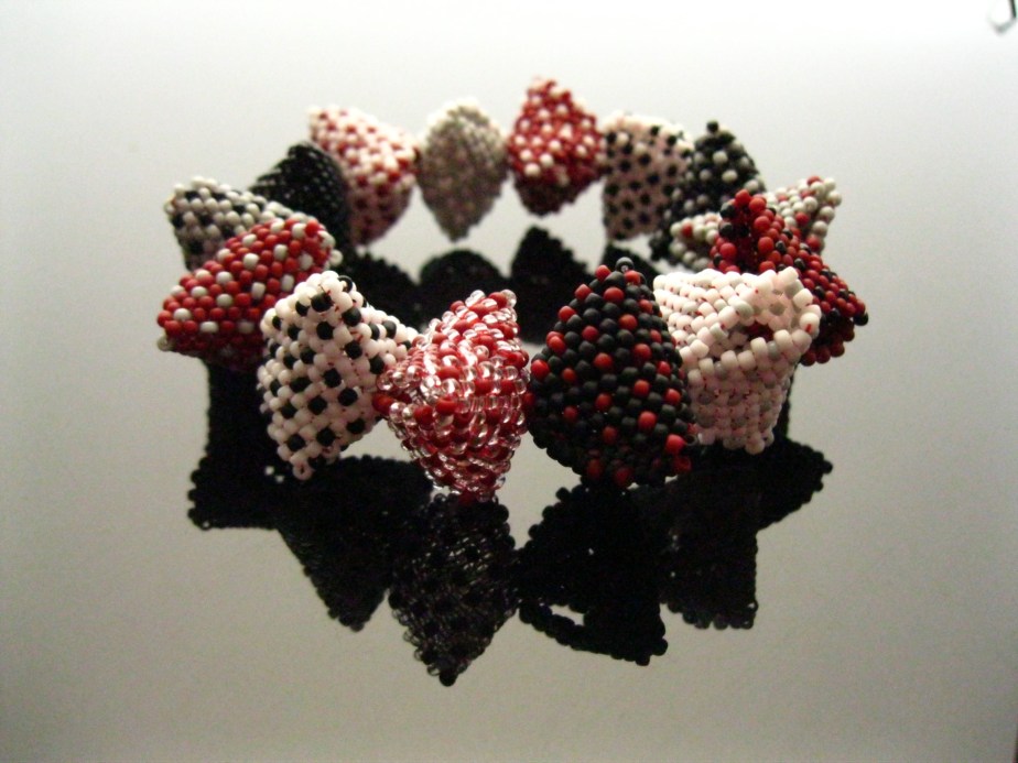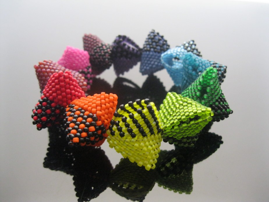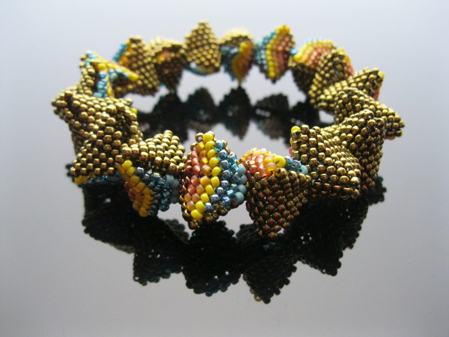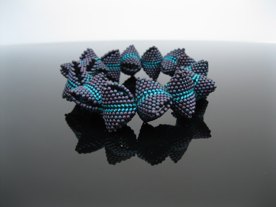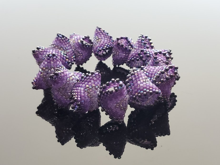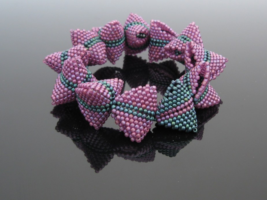 Design Notes: As the name suggests, the Starts and Ends with Three Bangle design is a continuous rope of folded flat triangles. It’s a chunky design but still comfortable to wear all day. There is a 60-degree orientation change as each triangle in the rope is stitched which I typically accentuate by adding patterns on only one face as it spirals around the rope. The Starts and Ends with Three Bangle also have a series of special Enhanced versions with added horns, wings, or a combination of added horns and wings.