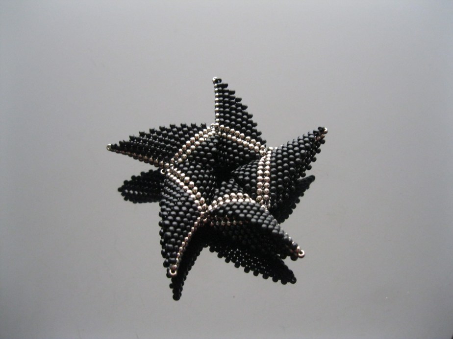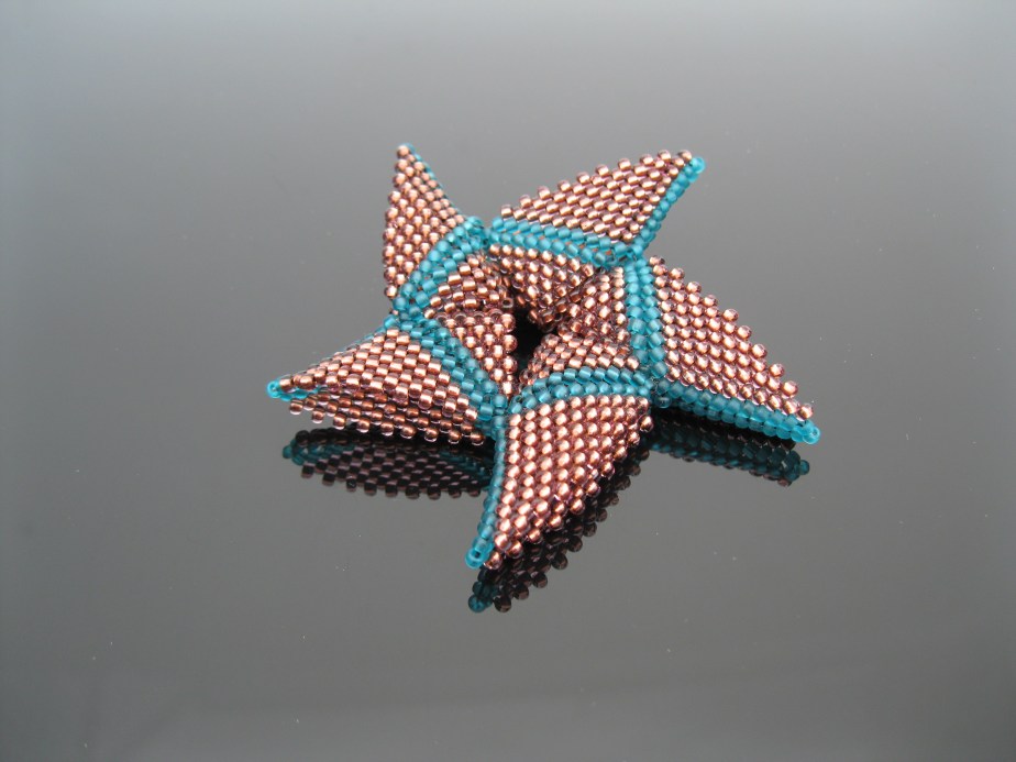Design Notes: The Throwing Star Brooch design is a continuous rope of folded flat triangles. Each brooch measures 2.75″ high x 2.75″ wide x 0.25″ deep. The brooch attaches with a base-metal 1″pin back. The points can also be rotated up to wear as a slide for a thin neck scarf.