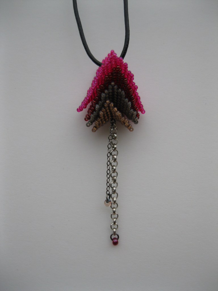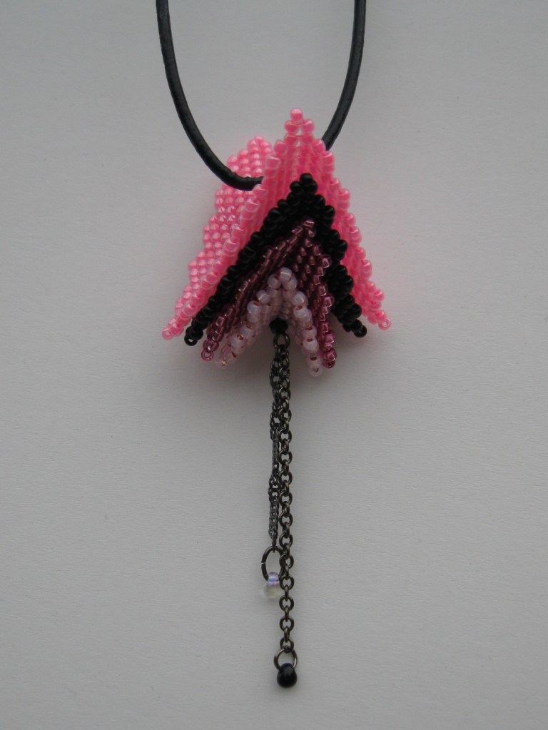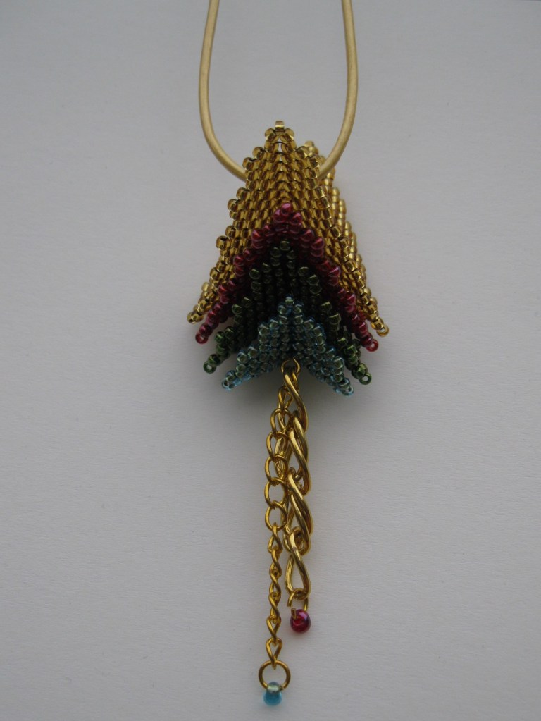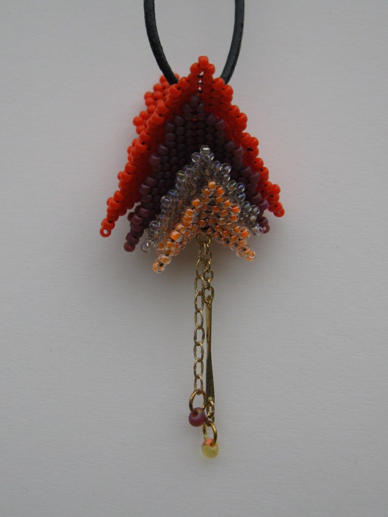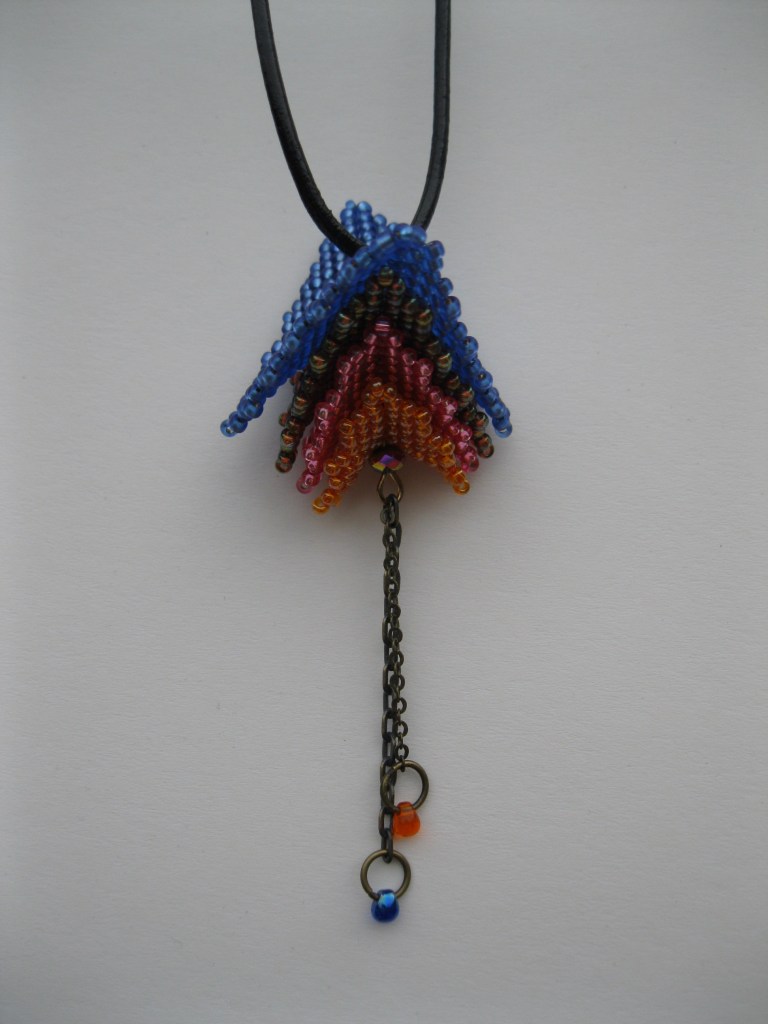 Design Notes: The Rain Chain Necklaces are reminiscent of the decorative yet functional Japanese rain chains and what better symbol to use to celebrate all the rainfall we receive in the Pacific Northwest’s temperate rainforest. Most of the color combinations was chosen by my son when he was a teenager and still living with us. The rain Chain Necklaces measure 1.75″ x 1.25″ across the beaded section with varying lengths of dangling chain, and are strung on 18″ long leather cord with a 2″ plated base-metal extender chain and lobster clasp.